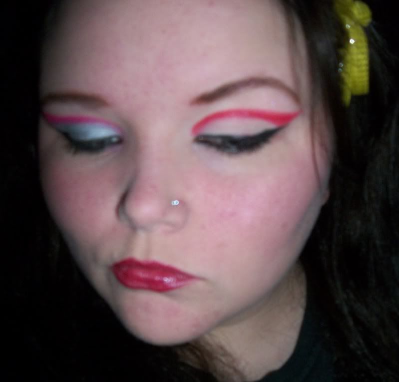 Hi all :) I was gonna post with day..10(?) today, but frankly, I was bored and decided it would be far more interesting for us all for me to post a makeup post instead :) I did these particular looks the night before I got sick and I figure its about time to post them :) The red/white eye-dea (hehe) came to me a few weeks ago and I had been dieing to try it! I really like the way it turned out! The other eye was done in a similar shape, although slightly different in a raspberry and metallic silver. This one was a total FAIL. The colors work well together but I think it would have looked better if I had done the exact same shape as the other eye. Oh well, trial and error is the name of the game :) Enjoy!
